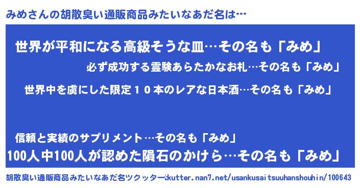 | ヒーロー風カッコイイあだ名 | 『仮面ミメダー』『ウルトラみめマン』 |