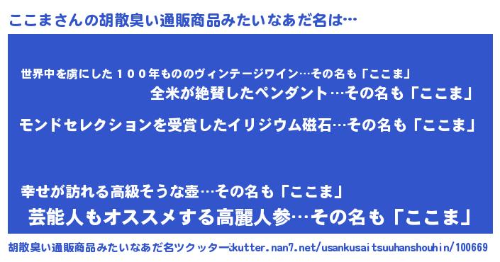 | 女子向けラノベタイトル風あだ名 | 『ここまの玉の輿計画!』『ここま恋絵巻』 |