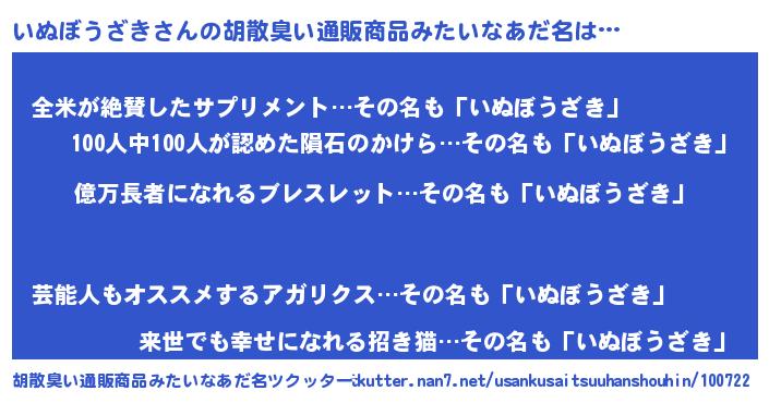 | 男性向けラノベタイトル風あだ名 | 『いぬぼうざき~年齢イコール彼女いない歴の魔法使い~』 |