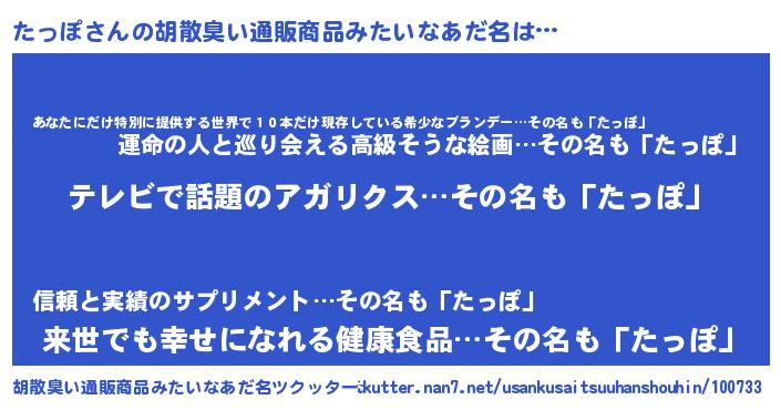 | 男性向けラノベタイトル風あだ名 | 『Re:たっぽから始める異世界生活』 |