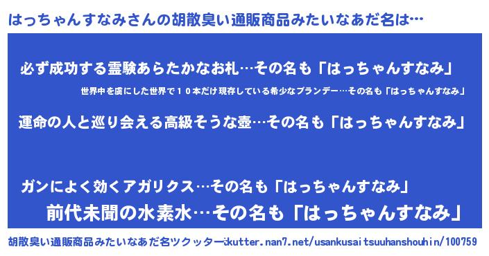 | 男性向けラノベタイトル風あだ名 | 『うちのはっちゃんすなみが世界を掌握している!』 |