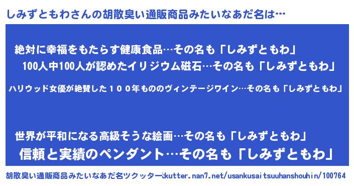 | 意味不明あだ名 | 『住所不定無職しみずともわ(6歳)』 |