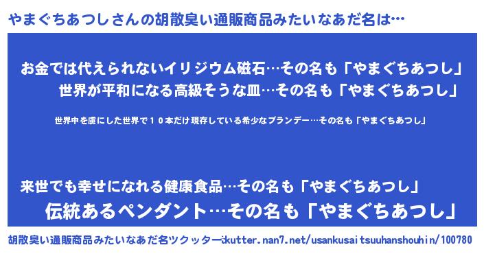 | 男性向けラノベタイトル風あだ名 | 『魔弾の王とやまぐちあつし』 |