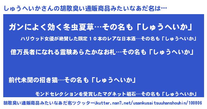 | ヘコむあだ名 | 『しゅっふぃ~』『しゅうへいか(震え声)』 |