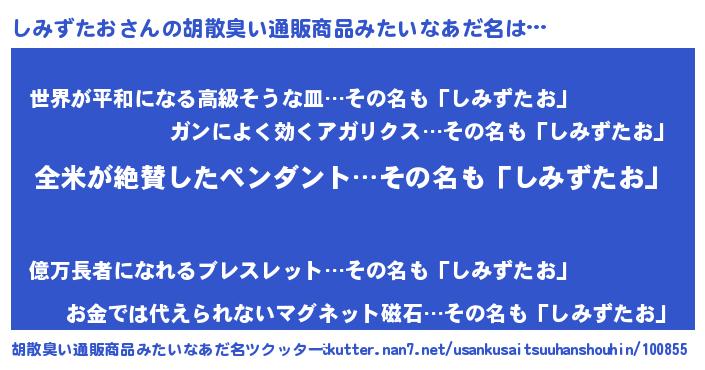 | 意味不明あだ名 | 『とにかく怪しいしみずたお』 |