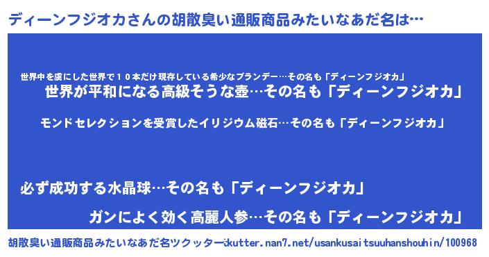 | 男性向けラノベタイトル風あだ名 | 『ノーゲーム・ノーディーンフジオカ』 |