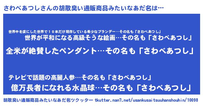 | 男性向けラノベタイトル風あだ名 | 『さわべあつし~年齢イコール彼女いない歴の魔法使い~』 |