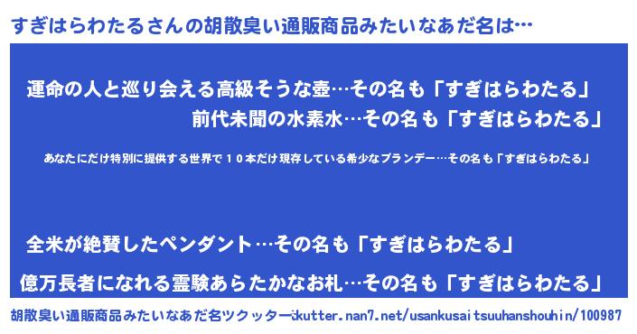 | 意味不明あだ名 | 『住所不定無職すぎはらわたる(79歳)』 |