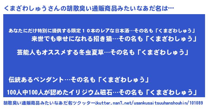 | 男性向けラノベタイトル風あだ名 | 『Re:くまざわしゅうから始める異世界生活』 |