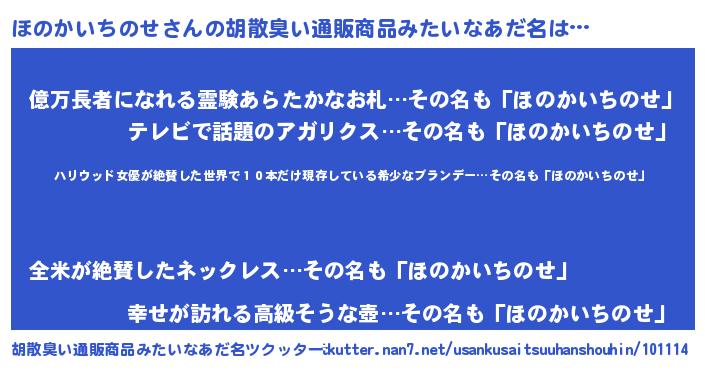 | 意味不明あだ名 | 『住所不定無職ほのかいちのせ(74歳)』 |