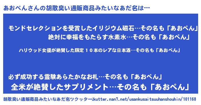 | 意味不明あだ名 | 『住所不定無職あおぺん(53歳)』 |