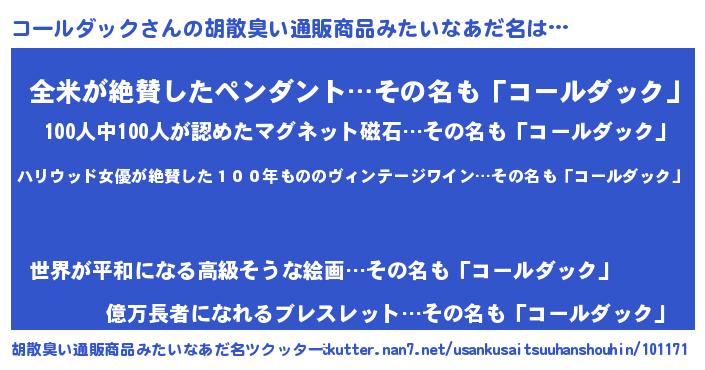| 女子向けラノベタイトル風あだ名 | 『コールダックが死なない童話 林檎のコールダックの診療簿』 |