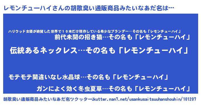 | 男性向けラノベタイトル風あだ名 | 『レモンチューハイの嫁は女の子じゃないと思った?』 |