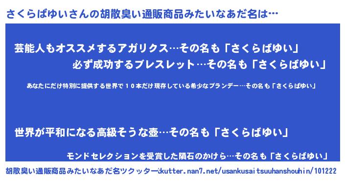 | 恥ずかしいあだ名 | 『サクラバユイデラックス』『さくっちょ』 |