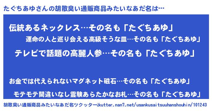 | 肩書あだ名 | 『たぐちあゆ船長』『たぐちあゆ総統』 |