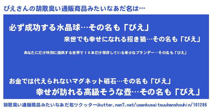 | 意味不明あだ名 | 『ニラ科びえ属』『住所不定無職びえ(95歳)』 |