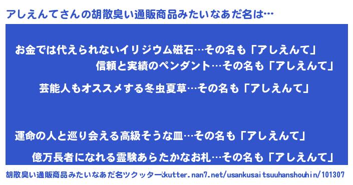 | 男性向けラノベタイトル風あだ名 | 『Re:アしえんてから始める異世界生活』 |
