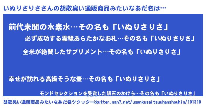 | 男性向けラノベタイトル風あだ名 | 『いぬりさりさの嫁は女の子じゃないと思った?』 |