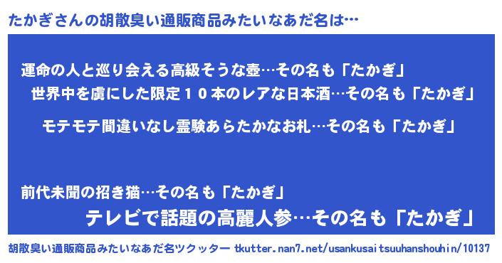| 男性向けラノベタイトル風あだ名 | 『たかぎの憂鬱』『はたらくたかぎさま!』 |