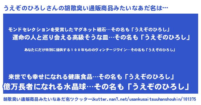 | 男性向けラノベタイトル風あだ名 | 『この素晴らしい世界にうえぞのひろしを!』 |