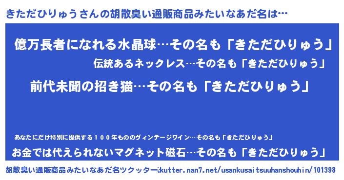 | 男性向けラノベタイトル風あだ名 | 『きただひりゅう~年齢イコール彼女いない歴の魔法使い~』 |