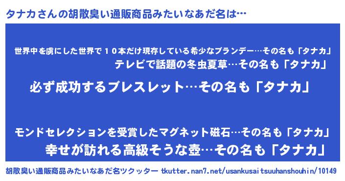 | 男性向けラノベタイトル風あだ名 | 『タナカの憂鬱』『魔弾の王とタナカ』 |