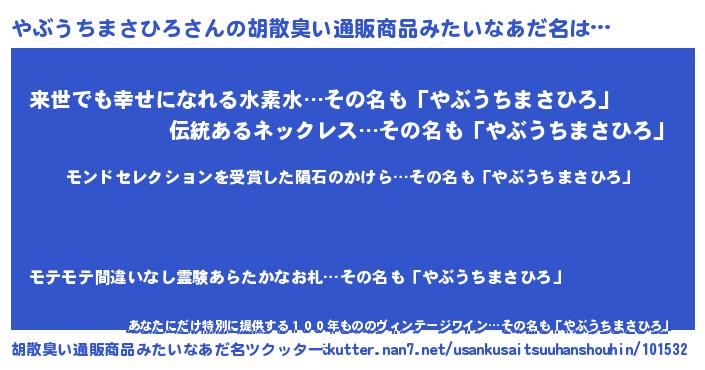 | 男性向けラノベタイトル風あだ名 | 『やぶうちまさひろ~年齢イコール彼女いない歴の魔法使い~』 |