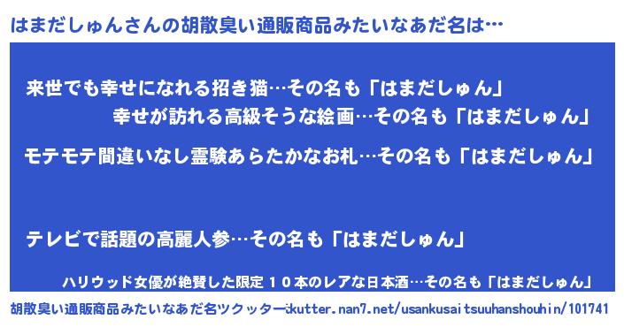 | 男性向けラノベタイトル風あだ名 | 『はまだしゅんの憂鬱』 |