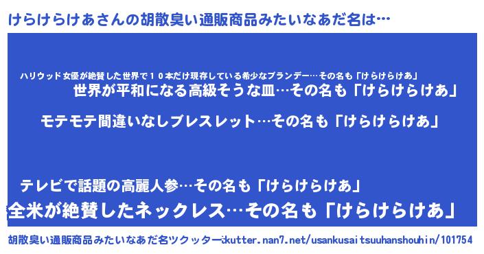 | 男性向けラノベタイトル風あだ名 | 『けらけらけあに滅ぼされるだけの簡単なお仕事です』 |