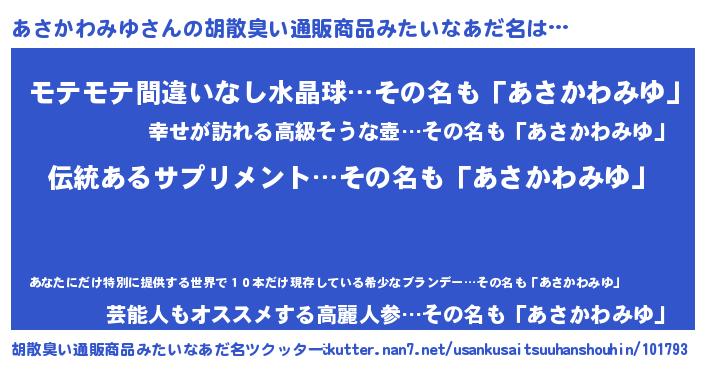 | 肩書あだ名 | 『あさかわみゆ団長』『あさかわみゆ総統』 |