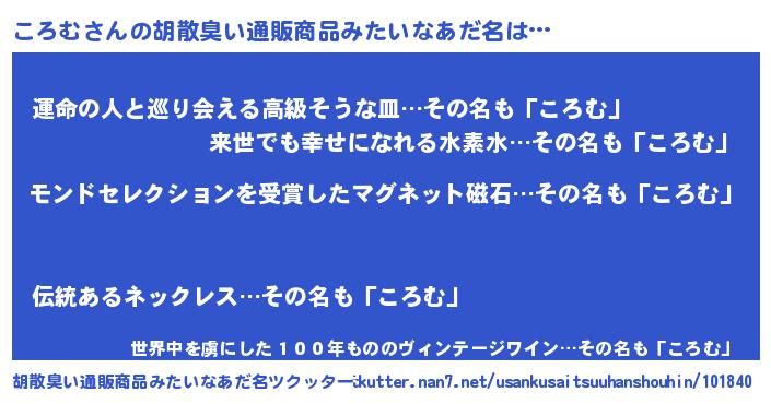 ころむさんの胡散臭い通販商品みたいなあだ名をツクッター!