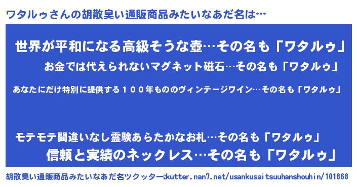 | 男性向けラノベタイトル風あだ名 | 『ワタルゥに滅ぼされるだけの簡単なお仕事です』 |