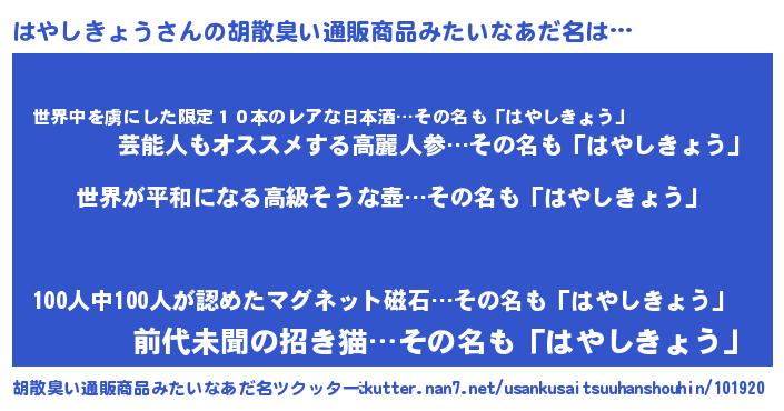 | 男性向けラノベタイトル風あだ名 | 『はやしきょうに滅ぼされるだけの簡単なお仕事です』 |