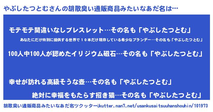 | ヘコむあだ名 | 『やぶにゅー』『やぶしたつとむ(震え声)』 |