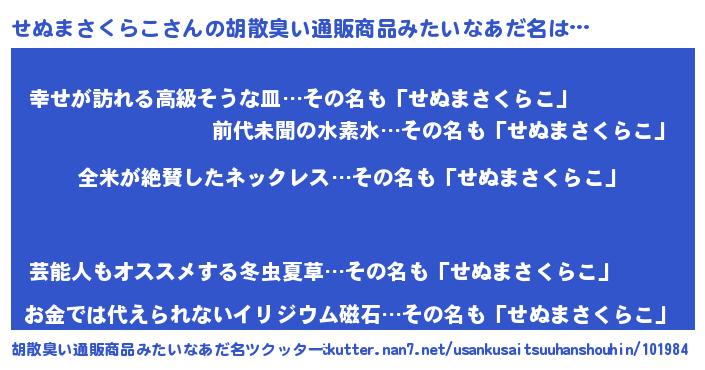 | 男性向けラノベタイトル風あだ名 | 『うちのせぬまさくらこが世界を掌握している!』 |