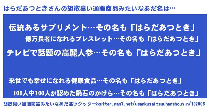 | 意味不明あだ名 | 『自称はらだあつとき』 |