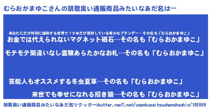 | 恥ずかしいあだ名 | 『プリティーむらおかまゆこ』『むらちん』 |