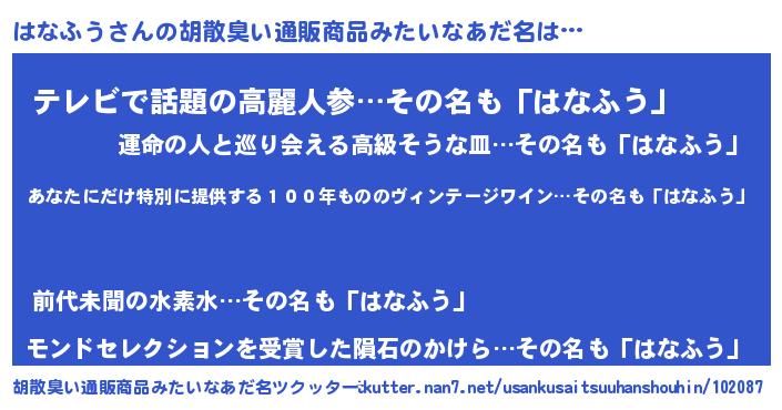 | 男性向けラノベタイトル風あだ名 | 『この素晴らしい世界にはなふうを!』 |