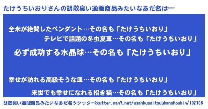 | 男性向けラノベタイトル風あだ名 | 『はたらくたけうちいおりさま!』 |