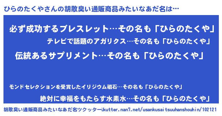 | 意味不明あだ名 | 『とにかく怪しいひらのたくや』 |