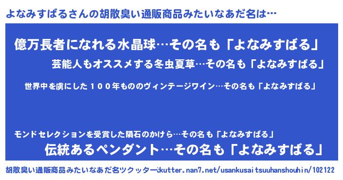 | 意味不明あだ名 | 『住所不定無職よなみすばる(4歳)』 |