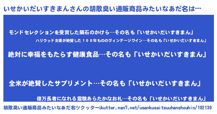| ヘコむあだ名 | 『いせかいだいすきまん(笑)』『いせもー』 |