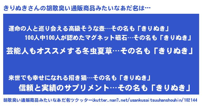 | 男性向けラノベタイトル風あだ名 | 『うちのきりぬきが世界を掌握している!』 |