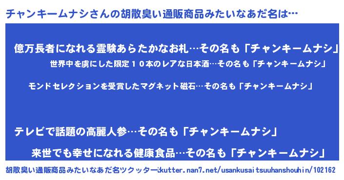 | 男性向けラノベタイトル風あだ名 | 『チャンキームナシ~年齢イコール彼女いない歴の魔法使い~』 |