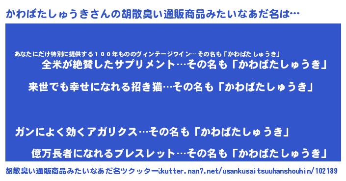 | 男性向けラノベタイトル風あだ名 | 『かわばたしゅうきという概念が存在しない退屈な世界 』 |