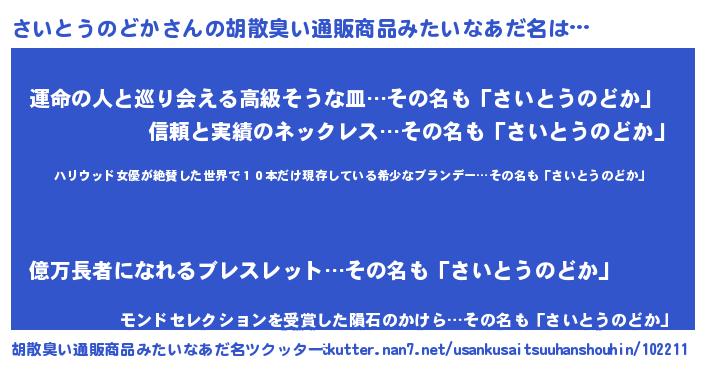 | 意味不明あだ名 | 『住所不定無職さいとうのどか(86歳)』 |