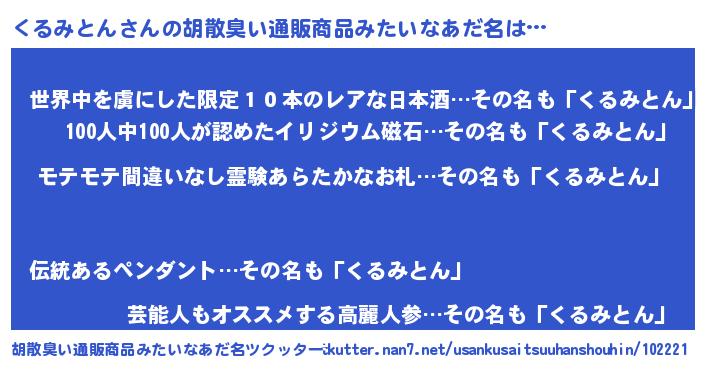 | 男性向けラノベタイトル風あだ名 | 『転生したらくるみとんだった件』 |
