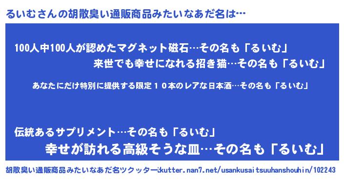 | 男性向けラノベタイトル風あだ名 | 『この素晴らしい世界にるいむを!』 |
