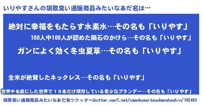| 意味不明あだ名 | 『自称いりやす』『永久保存いりやす』 |