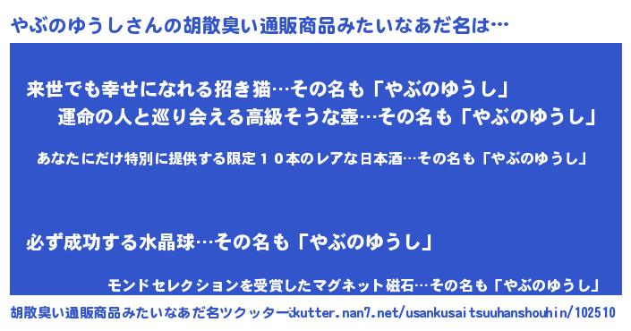 | 男性向けラノベタイトル風あだ名 | 『この素晴らしい世界にやぶのゆうしを!』 |